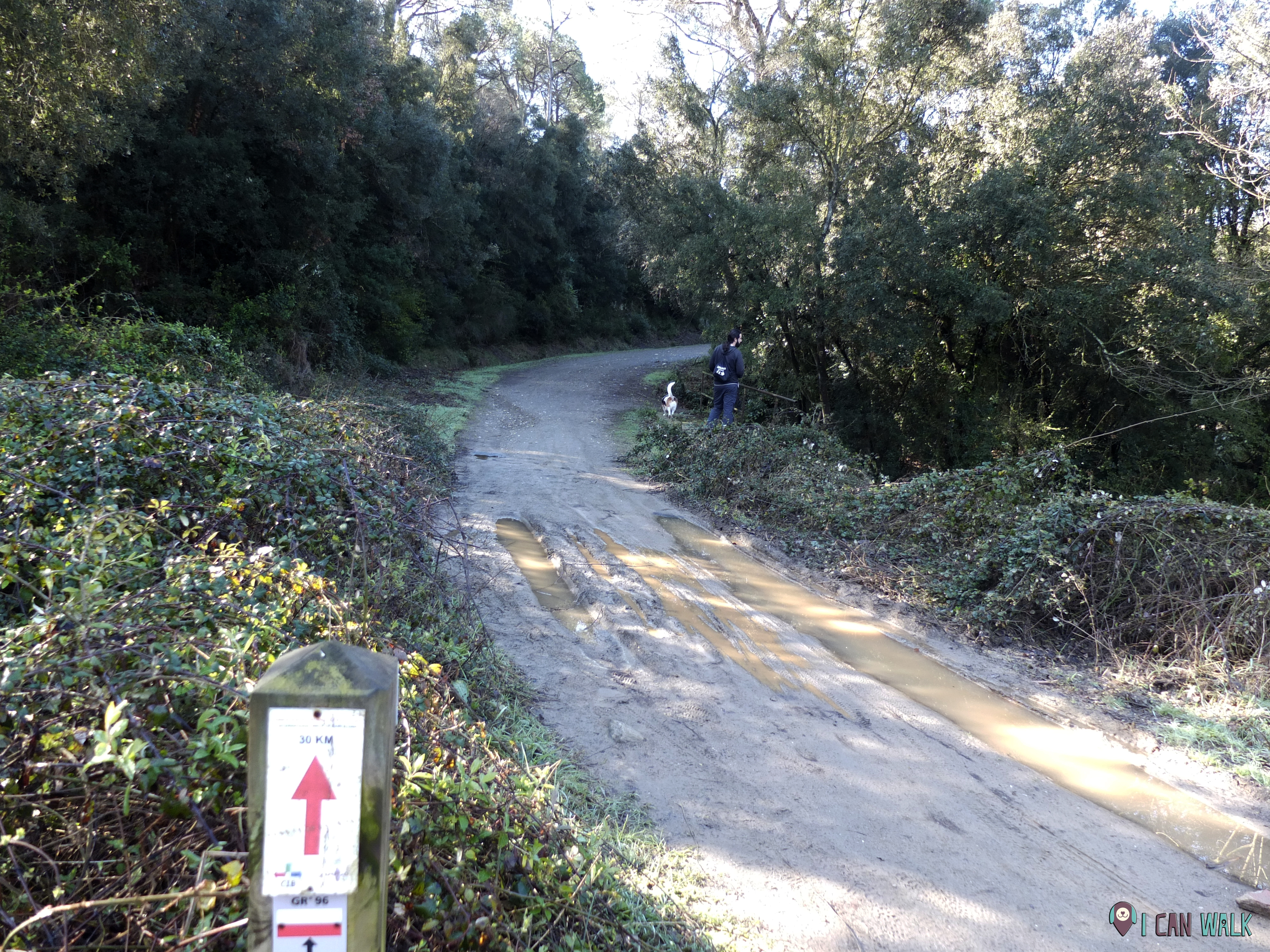 Pasada la casa de Can Busquets, has de seguir el camino que rodea la casa, dónde verás un cartel de «prohibido circular bicis y motos», siguiendo la GR96.