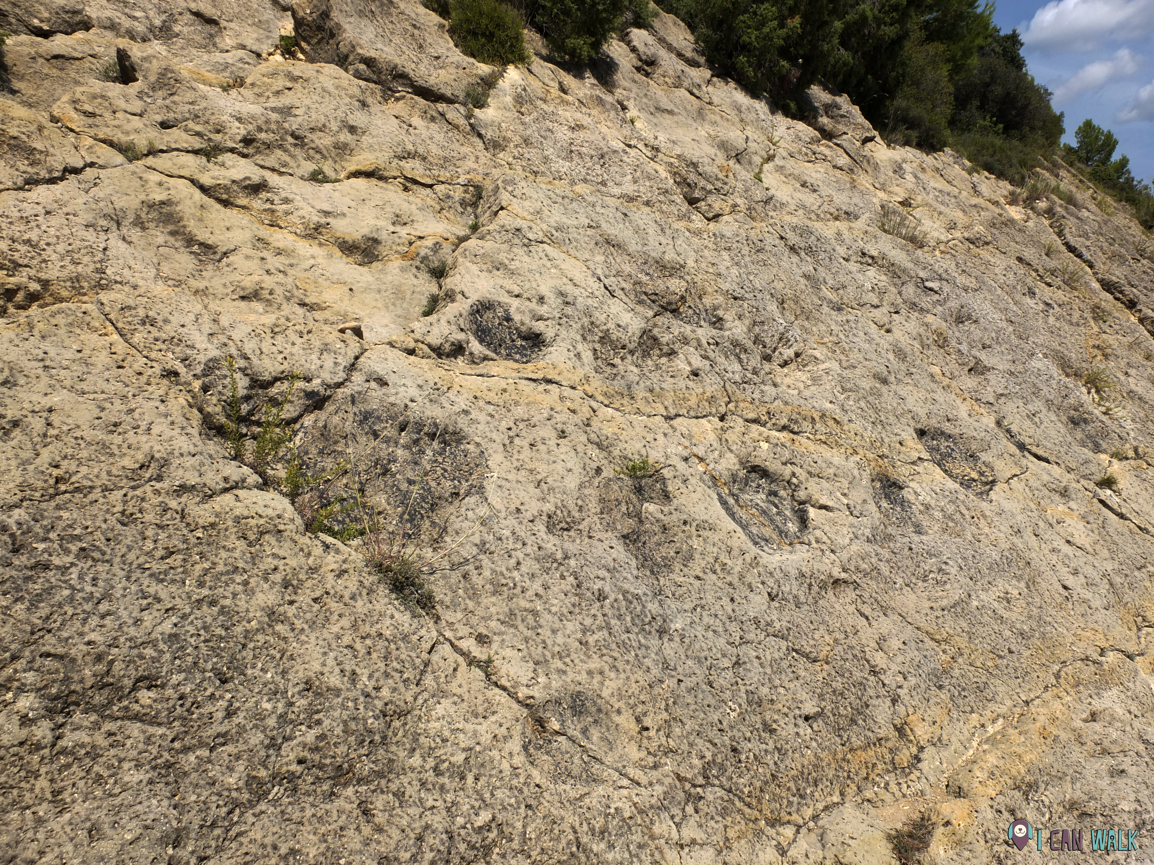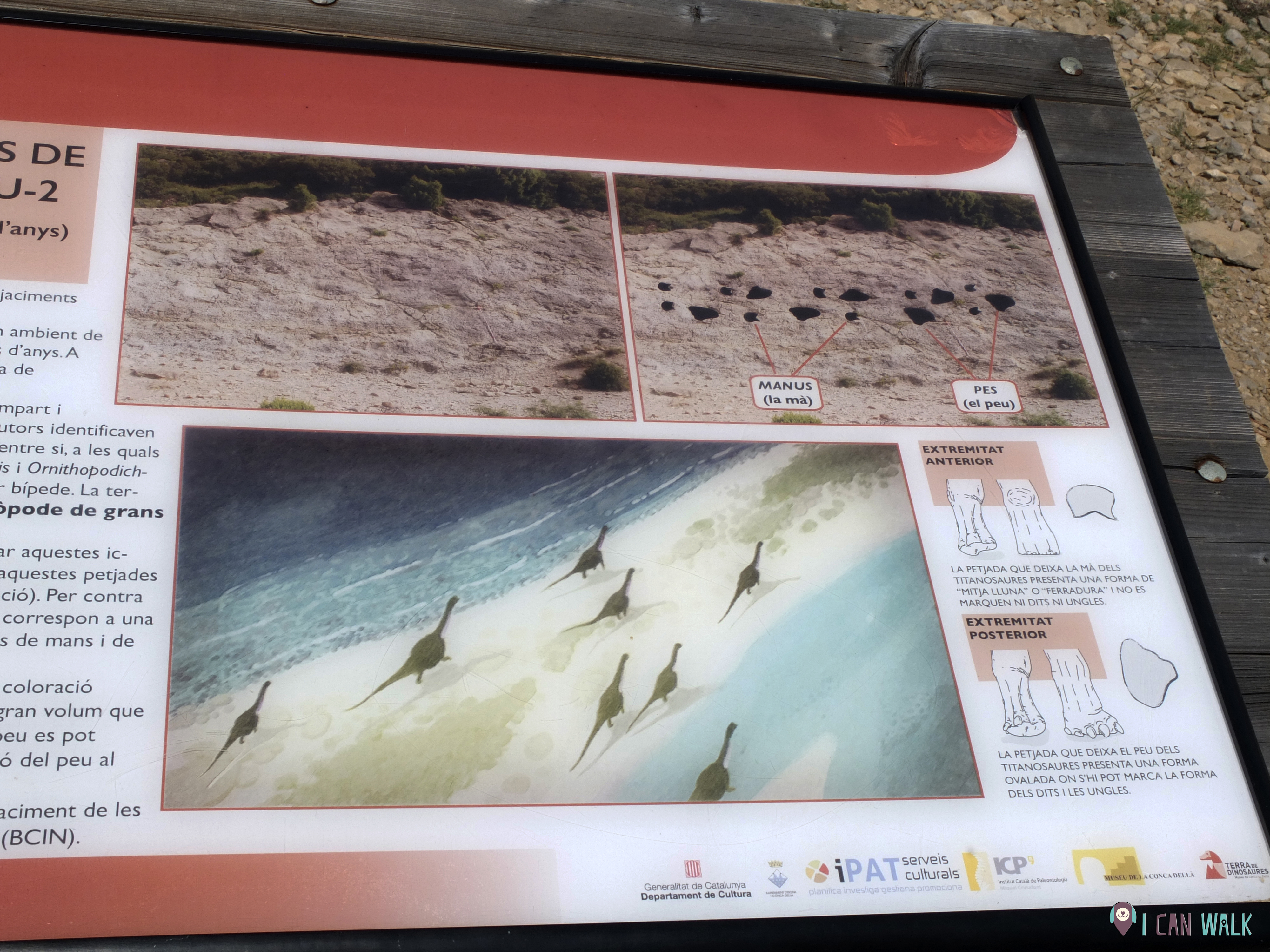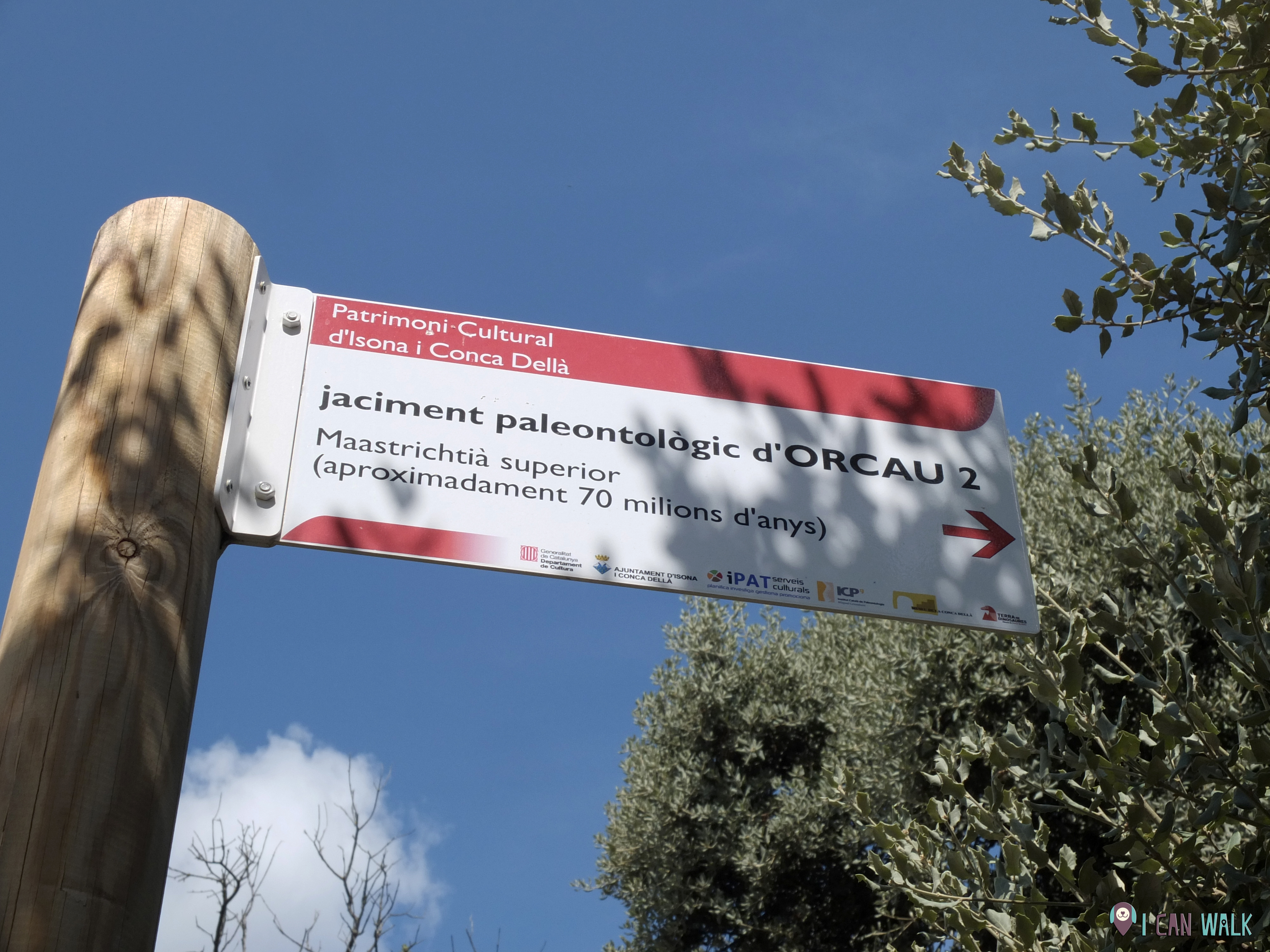 – La entrada al camino que va al yacimiento de Orcau 2 está justo al inicio del camino al Castillo del pueblo de Orcau. Se trata de un yaciminto con pisadas de Titanosaurio, un gran dinosaurio que paseó por allí hace unos 70 millones de años.