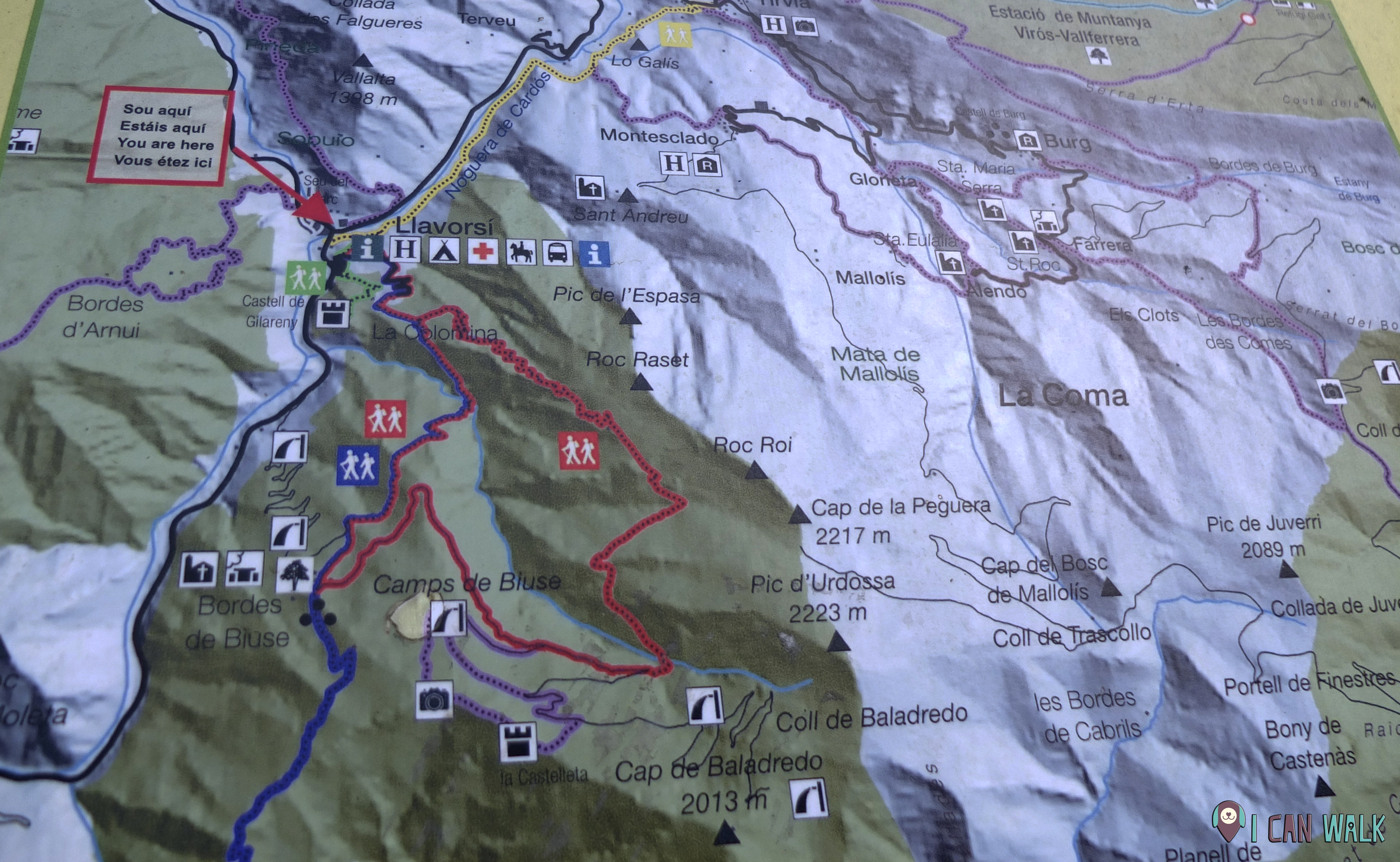 Para llegar a este paseo que va al lado del rio, hemos seguido la carretera (dirección Sort, para entendernos), y hemos pasado por el túnel hasta llegar a la entrada al Yeti Emotions. Por esta zona vigila ya que es una carretera y pasan coches.