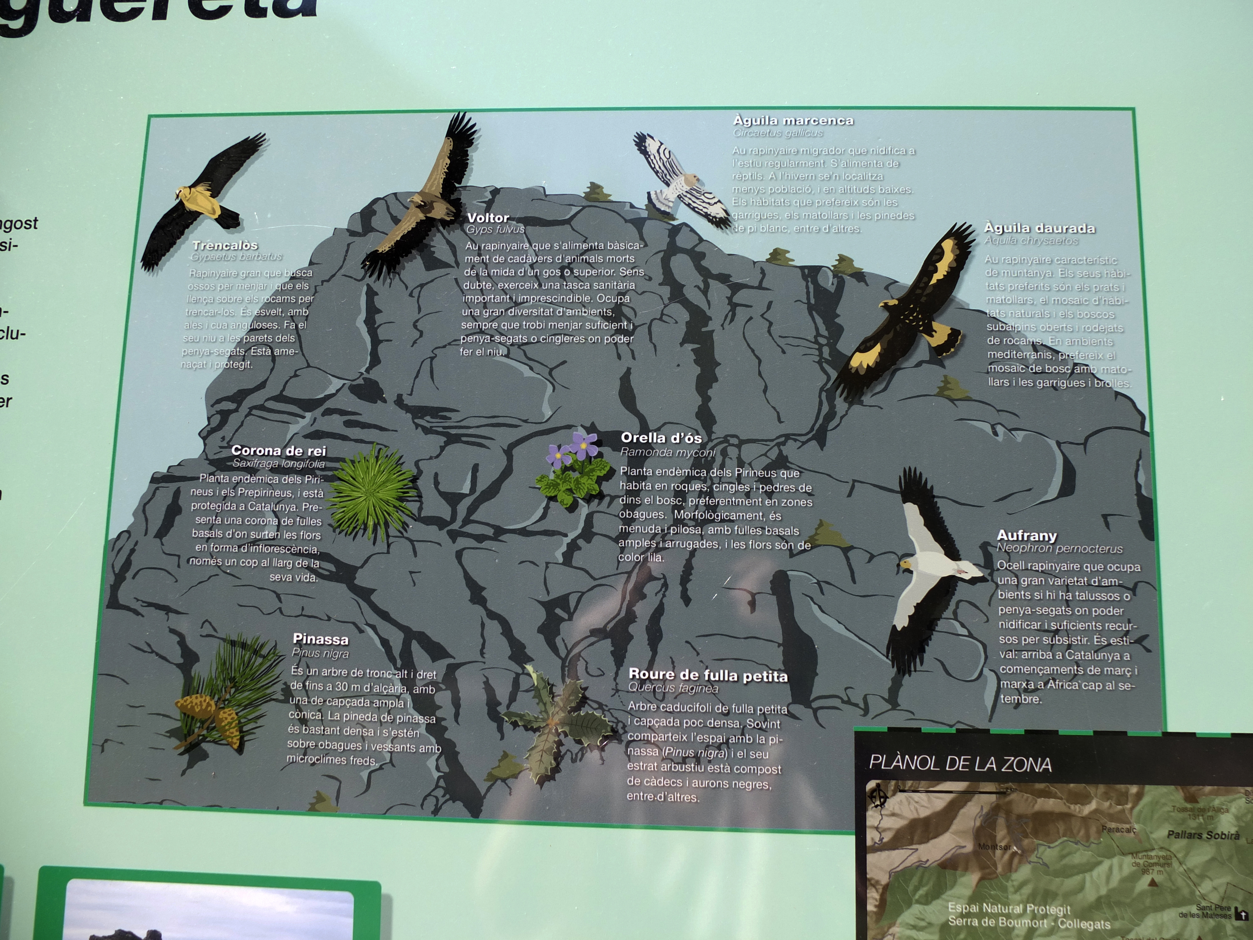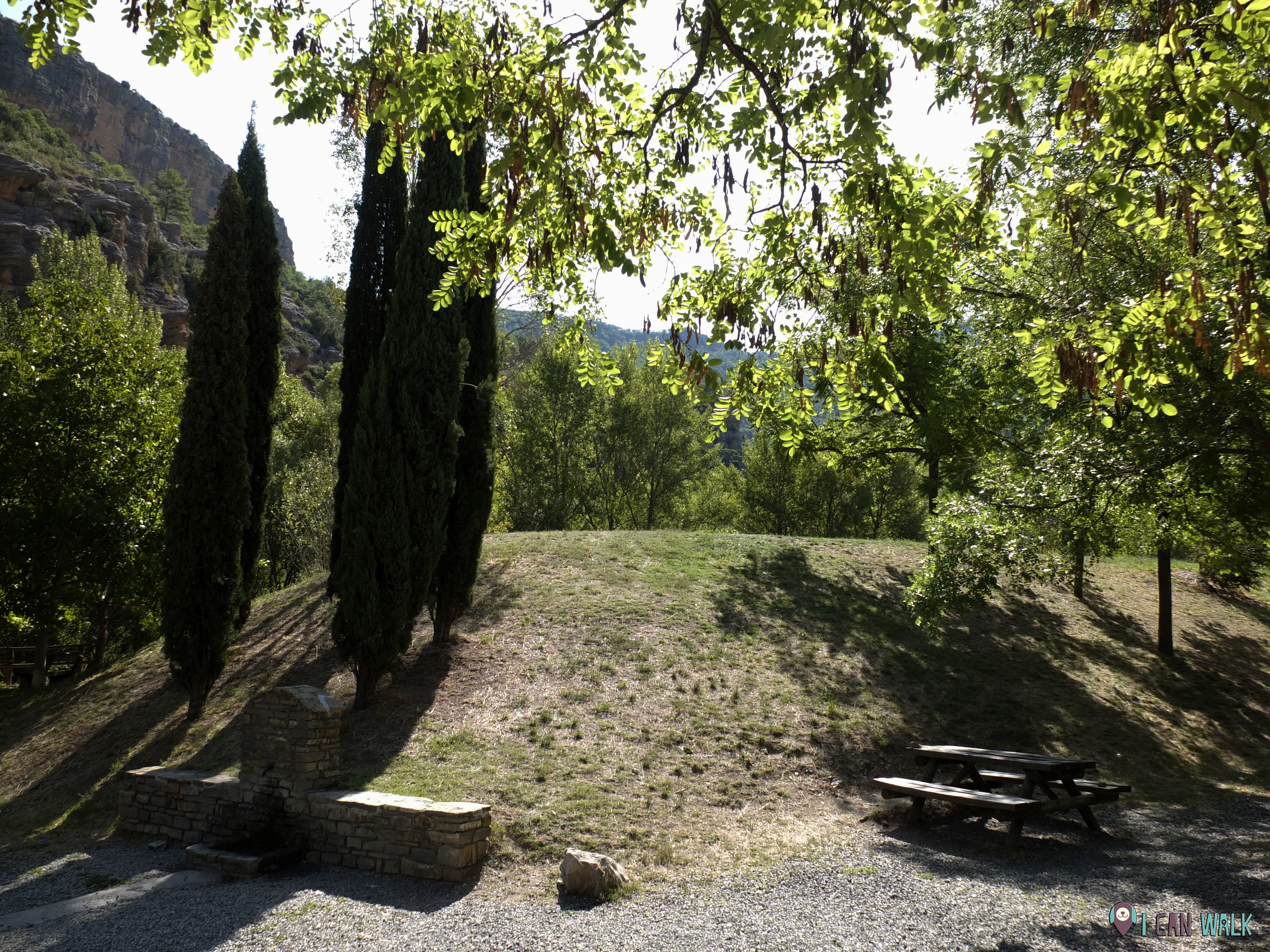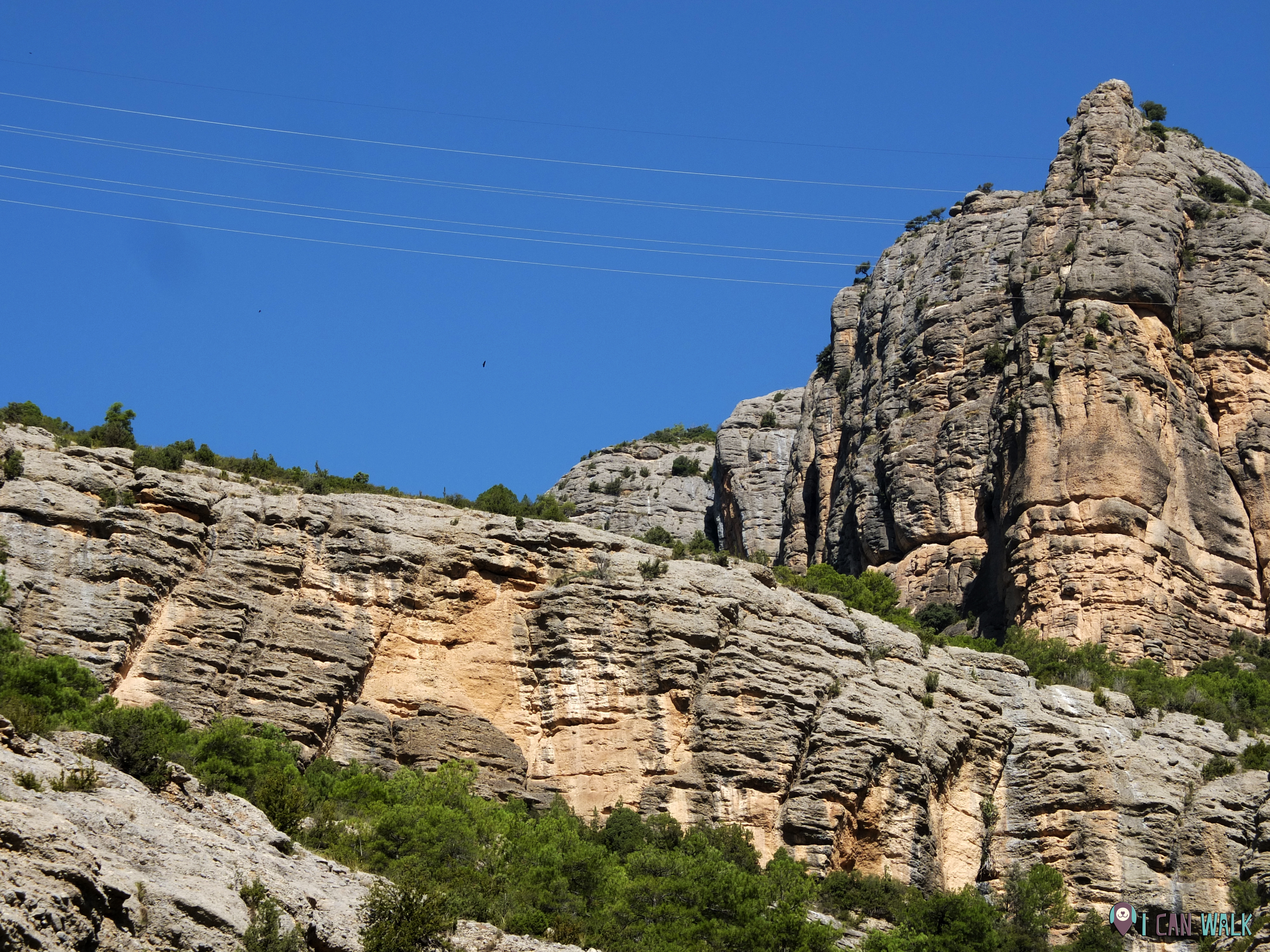 Seguimos el camino hasta un área de picnic llamado Font de la Figuereta. No paramos para comer sino porque esta zona está rodeada de unas paredes de montaña dónde viven gran cantidad de rapaces. Hemos parado a mirarlos con los prismáticos. Recuerda que estas al lado de la carretera, mucho cuidado.