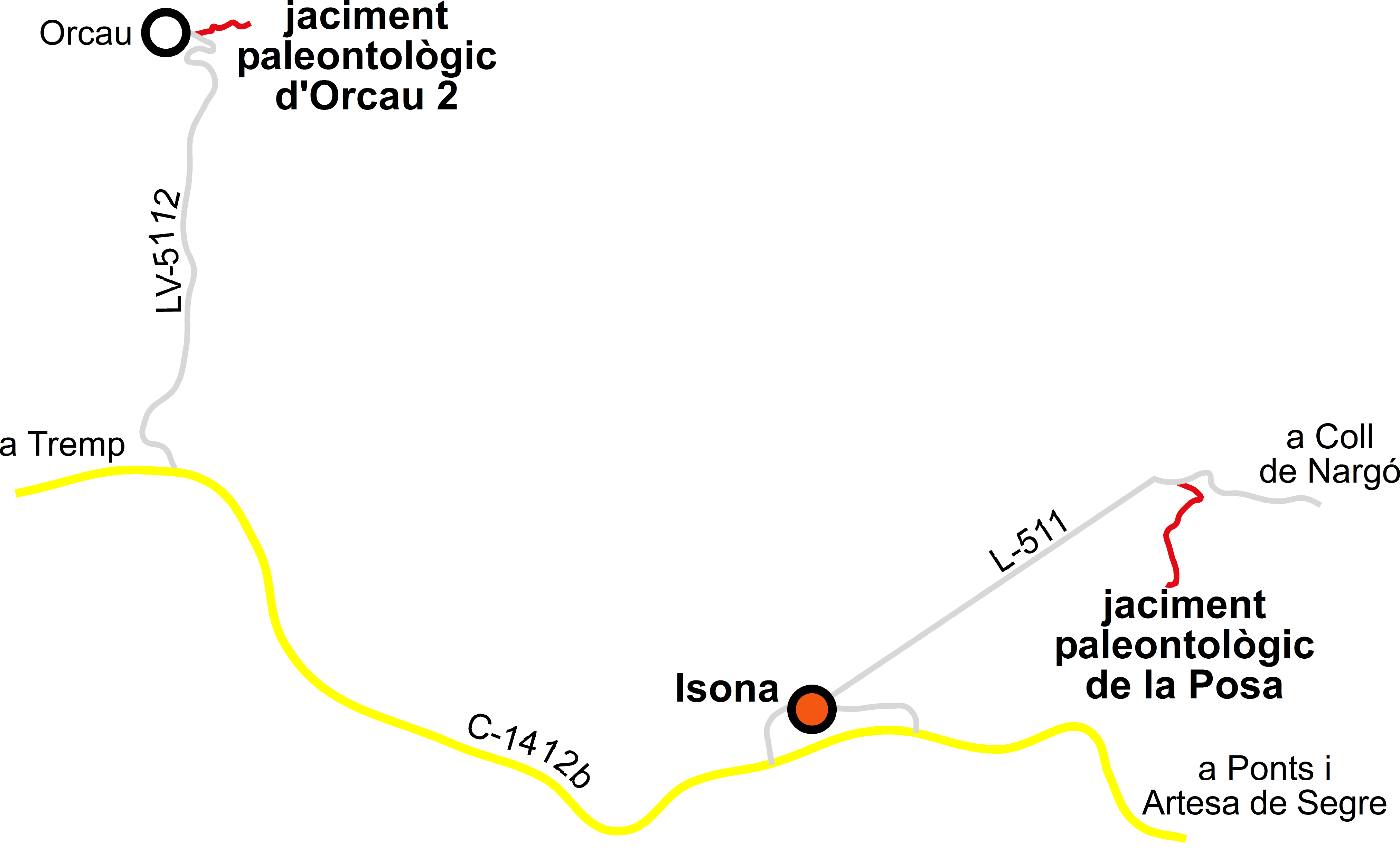 Muy cerca de este pueblo están los Yacimientos paleontológicos de La Posa y de las pisadas de dinosaurios d’Orcau 2. Puedes ir a visitarlos (foto con mapa orientativo de localizaciones):