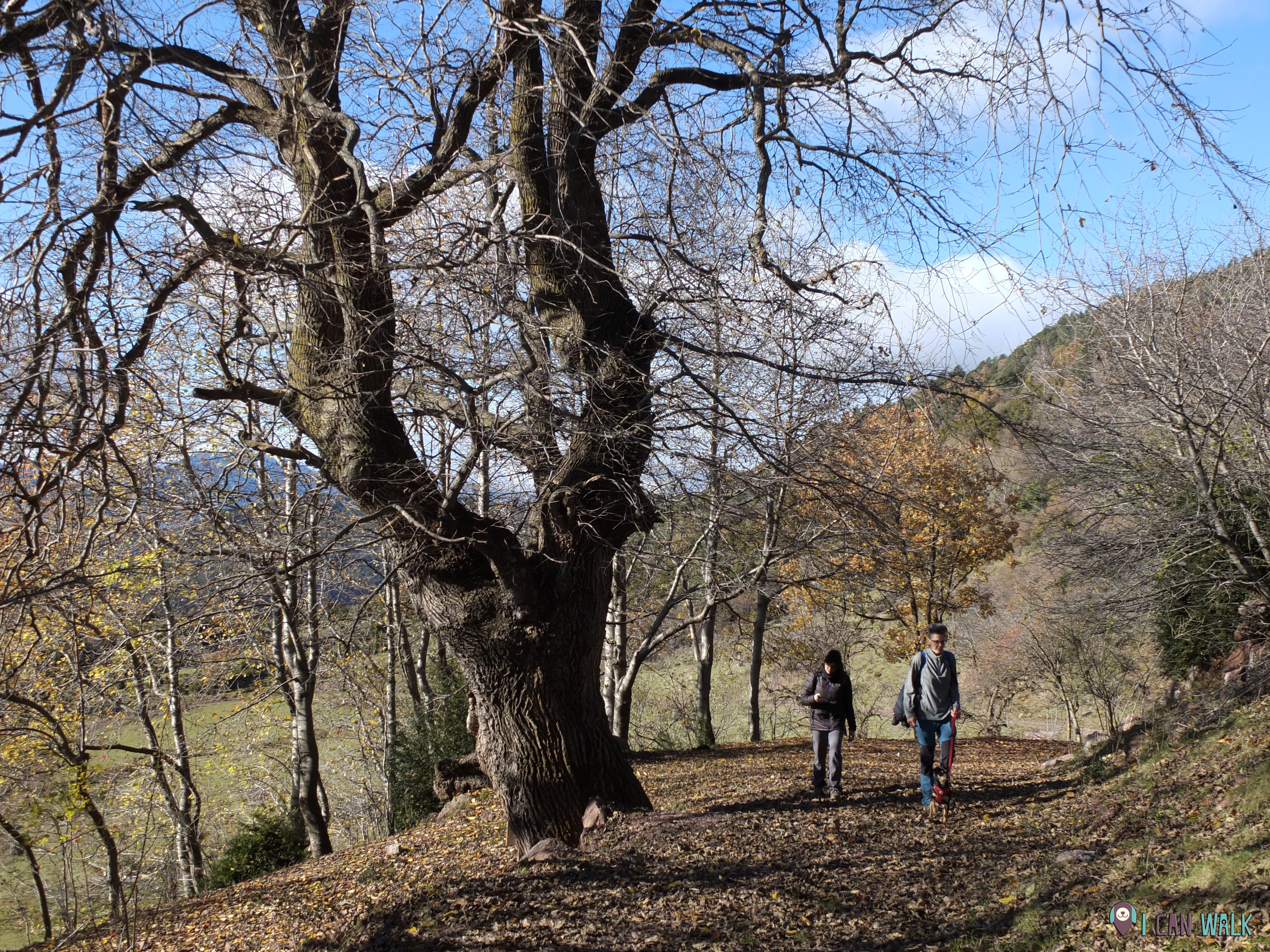 Este tramo no tiene pérdida, el camino asciende hasta una casa dónde verás un olmo, «Om de Cal Pau solana», desde donde has de seguir el camino hacia la izquierda. Nosotros nos hemos encontrado cadenas electrificadas para evitar el paso del ganado, es muy importante recordar que, si retiras una cadena o abres una valla para pasar, has de dejarla como la encontraste.