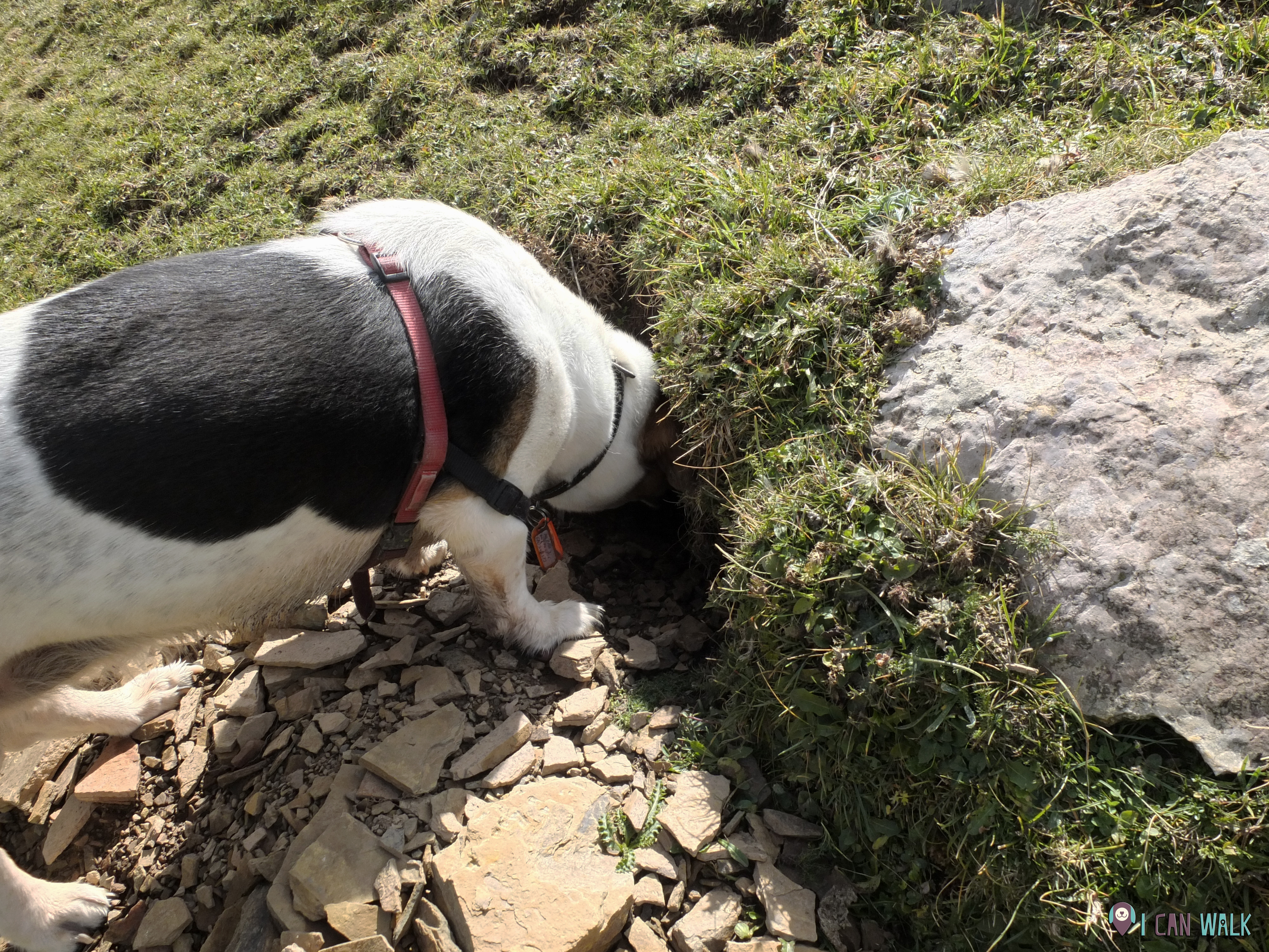 En este punto comenzamos el descenso. El primer tramo no vamos por camino, sino que vamos bajando por el otro lado de la cima. Hemos visto muchas madrigueras en el suelo, y Milka se ha vuelto loca con los olores. Cuando hemos vuelto con el grupo esta zona estaba bastante nevada.