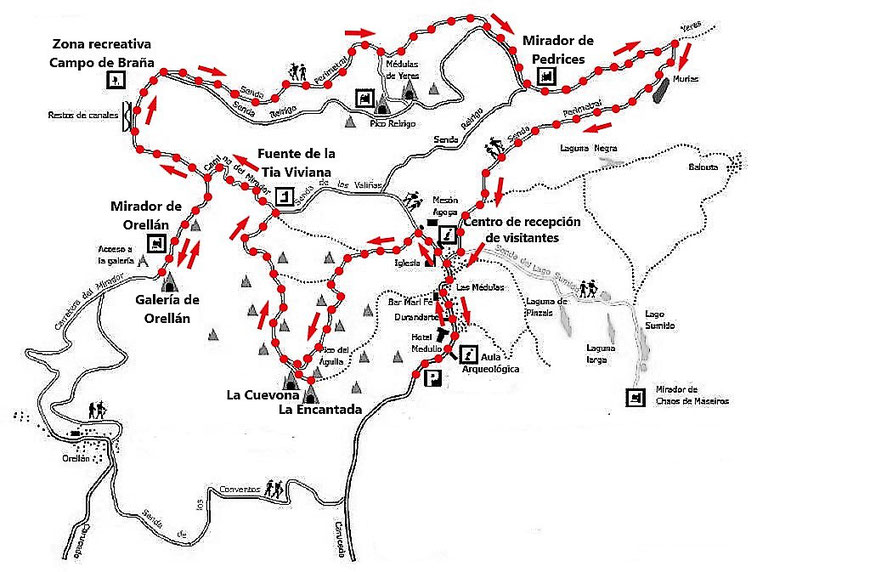 Nuestra ruta comienza en el aparcamiento que está a la entrada del pueblo de Las Médulas, donde dejaremos el coche. En el mapa está marcado como una «P».