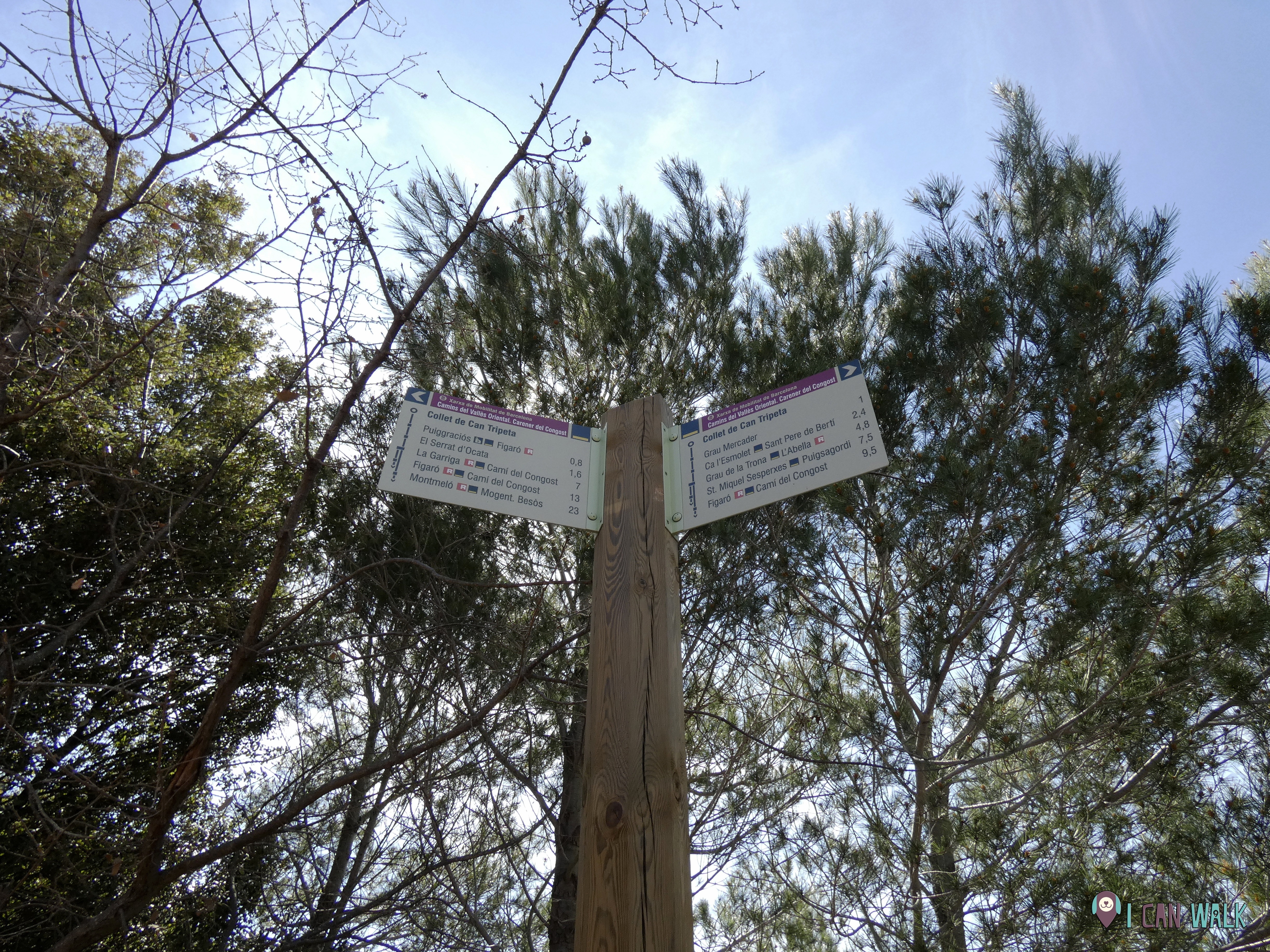 Vamos a seguir este camino, hasta llegar a un desvío indicado con un poste vertical como «Collet de Can Tripeta«. Ya verás que el camino recto está marcado con una cruz que indica que la ruta no sigue por allí, has de seguir a mano derecha siguiendo las indicaciones.