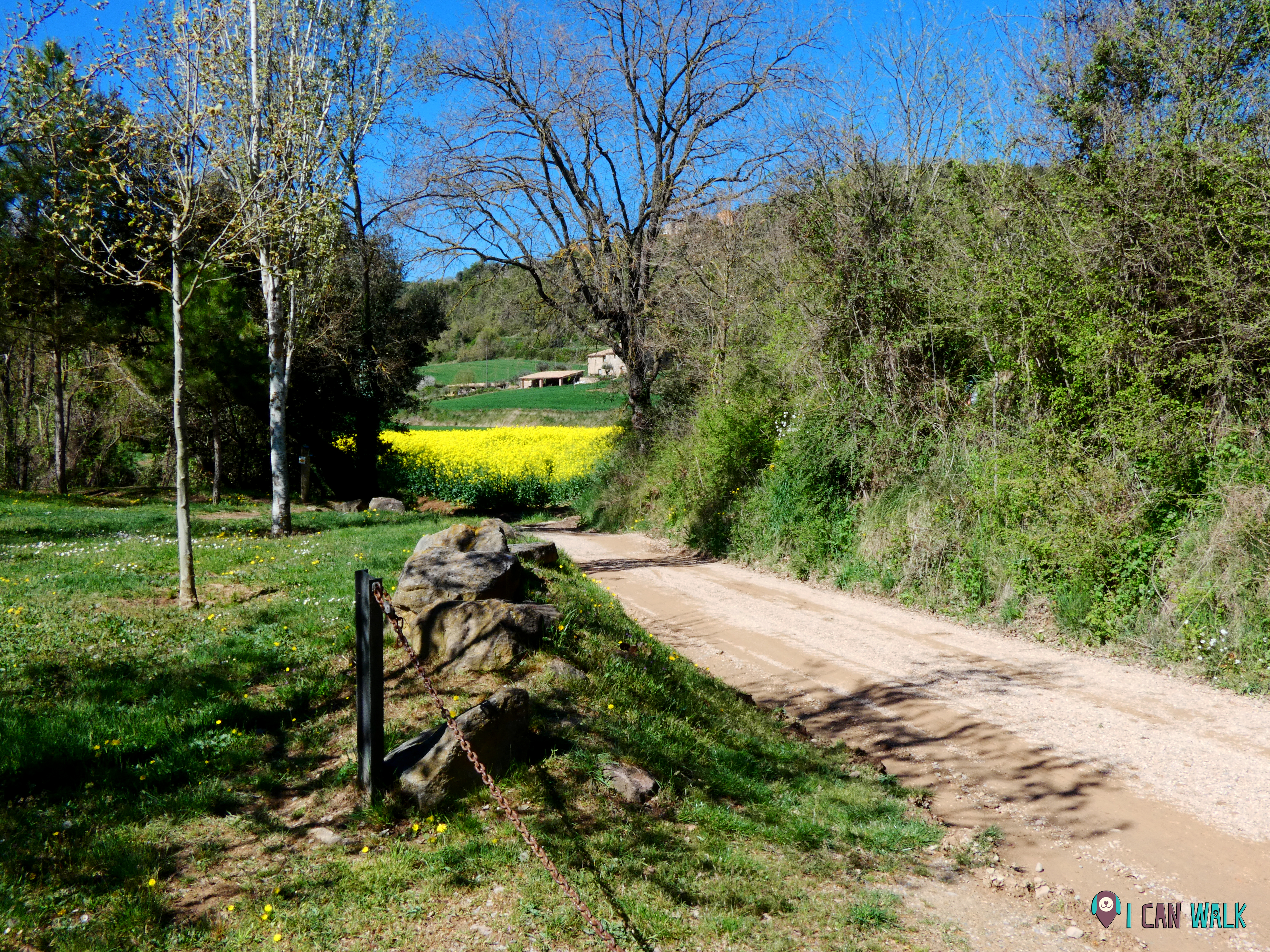 A mano derecha verás un puente que pasa bajo la carretera, indicado con un poste como itinerari botànic. Has de seguir esta indicación y llegarás a un pequeño tramo con bonitos árboles y dos fuentes: Font del Manel y Font de la mina.