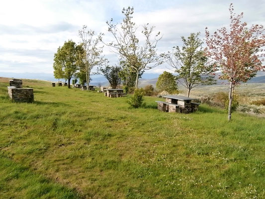 Después de beber agua nosotros y nuestro perro volveremos siguiendo por la calle que sale de frente por la derecha de la iglesia. Continuando por ella llegaremos a la plaza y al final a una amplia explanada verde con mesas de piedra, donde podremos comer en compañía de nuestro perro. Además, cuenta con un mirador con unas vistas espectaculares.