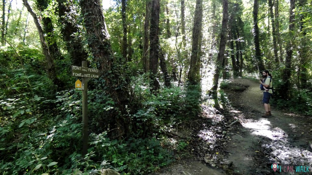 Una vez pases la fuente, has de seguir por un sendero a mano derecha, indicado como Font del Ferro, Font del Noi Gran, y puede que tengas que cruzar el curso del agua de una pequeña fuente natural que brota a un lado del camino.