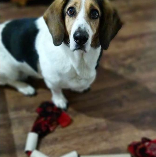 – Opción fácil: Damos la orden de sentarse y de quedarse quieta, escondemos alguna chuche, y Milka ha de mantenerse quieta hasta darle la orden de buscar las chuches (en esta opción, sabe dónde están escondidas, las ha visto, aquí estamos practicando las palabras «seu, quieta, busca…» principalmente).