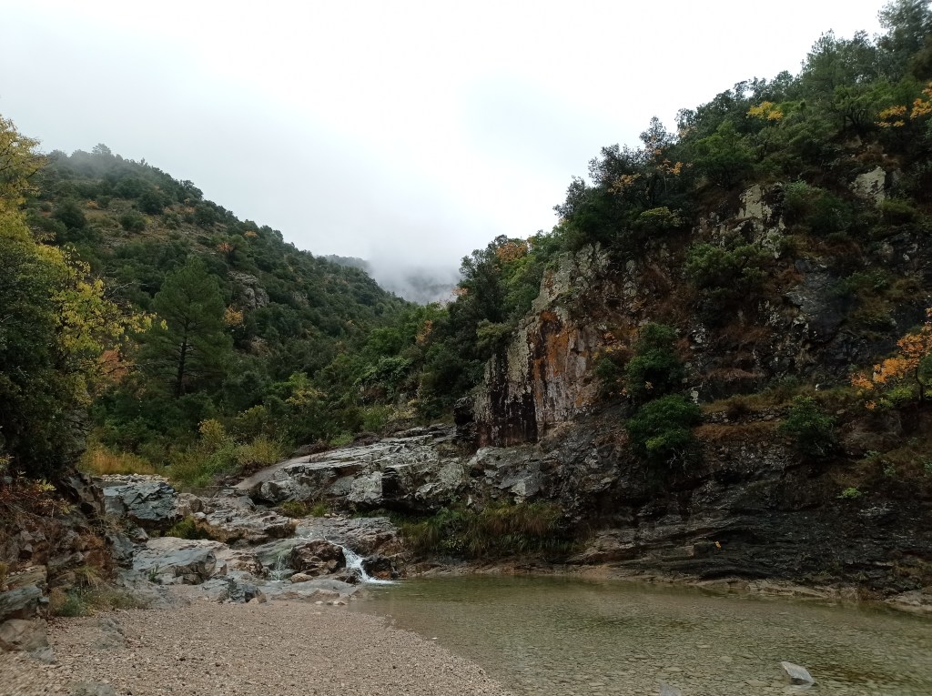 Cuando llegues a la piedra que sustenta un pequeño santuario de la Virgen del Pilar, sigue por el camino de la derecha señalizado como Cascada del Estrecho. En varios puntos puedes acercarte al río, pero recuerda que tu perro ha de ir atado, no lo sueltes para que se bañe.