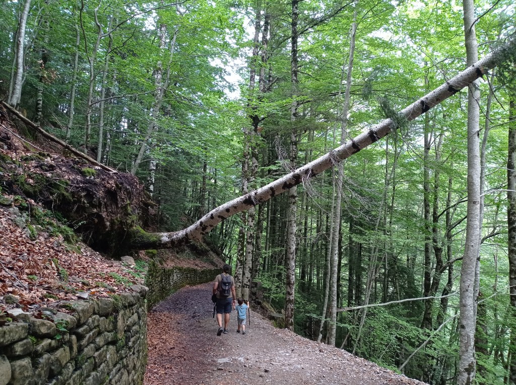 Opción B: Coger el camino de Turieto Alto, que va por la derecha y asciende hasta el hayedo-abetal de Ordesa, ambos caminos se unen hacia el final, y por el puente de la Senda de los Cazadores se llega a la Pradera de Ordesa. Aquí comienzan otras rutas que te explico más adelante.