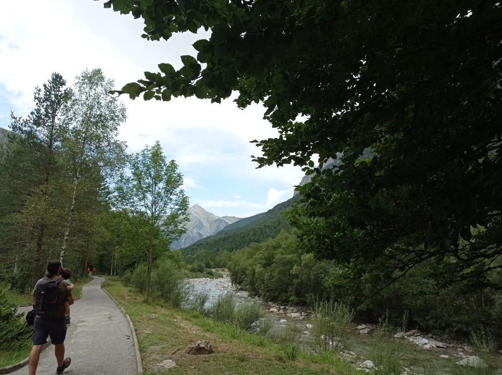 Por la tarde hemos ido a Broto, ya que no ha llegado la lluvia a esta zona. No es un pueblo muy grande, pero hemos paseado cerca del río donde mucha gente se estaba bañando y hemos tomado un helado en la terraza del establecimiento de Pacharán Ordesano. También puedes visitar la cascada de Sorrosal en Broto.