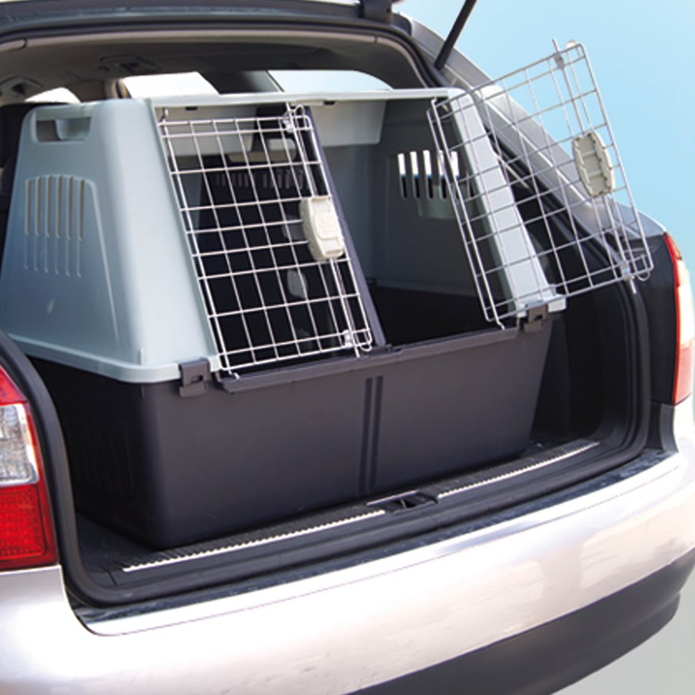 – Trasportín: en caso de trasportines pequeños se recomienda llevarlos en el suelo del vehículo, mientras que los de gran tamaño se tienen que llevar en el maletero. Han de colocarse en dirección perpendicular al de la marcha del vehículo. Ten cuidado porque atarlos con el cinturón de seguridad no es nada seguro, ya que pueden salir disparados en caso de colisión (el cinturón está pensado para otro tipo de sujeción).