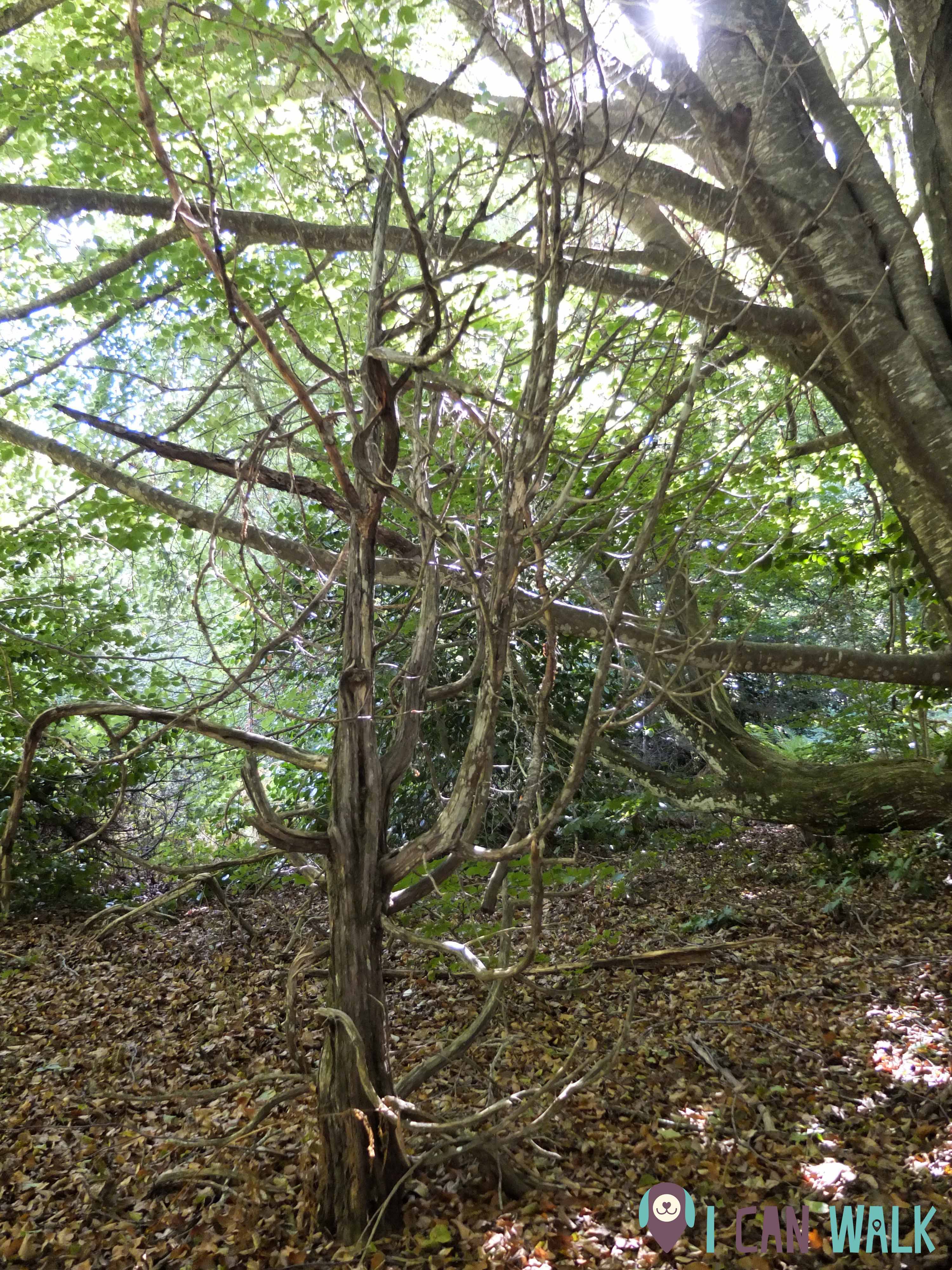 Llegarás a una zona donde el camino tiene unas ramas de árbol seco que “caen” haciendo arco sobre el camino, si estas solo y sin ruidos, le da un aire de bosque encantado.