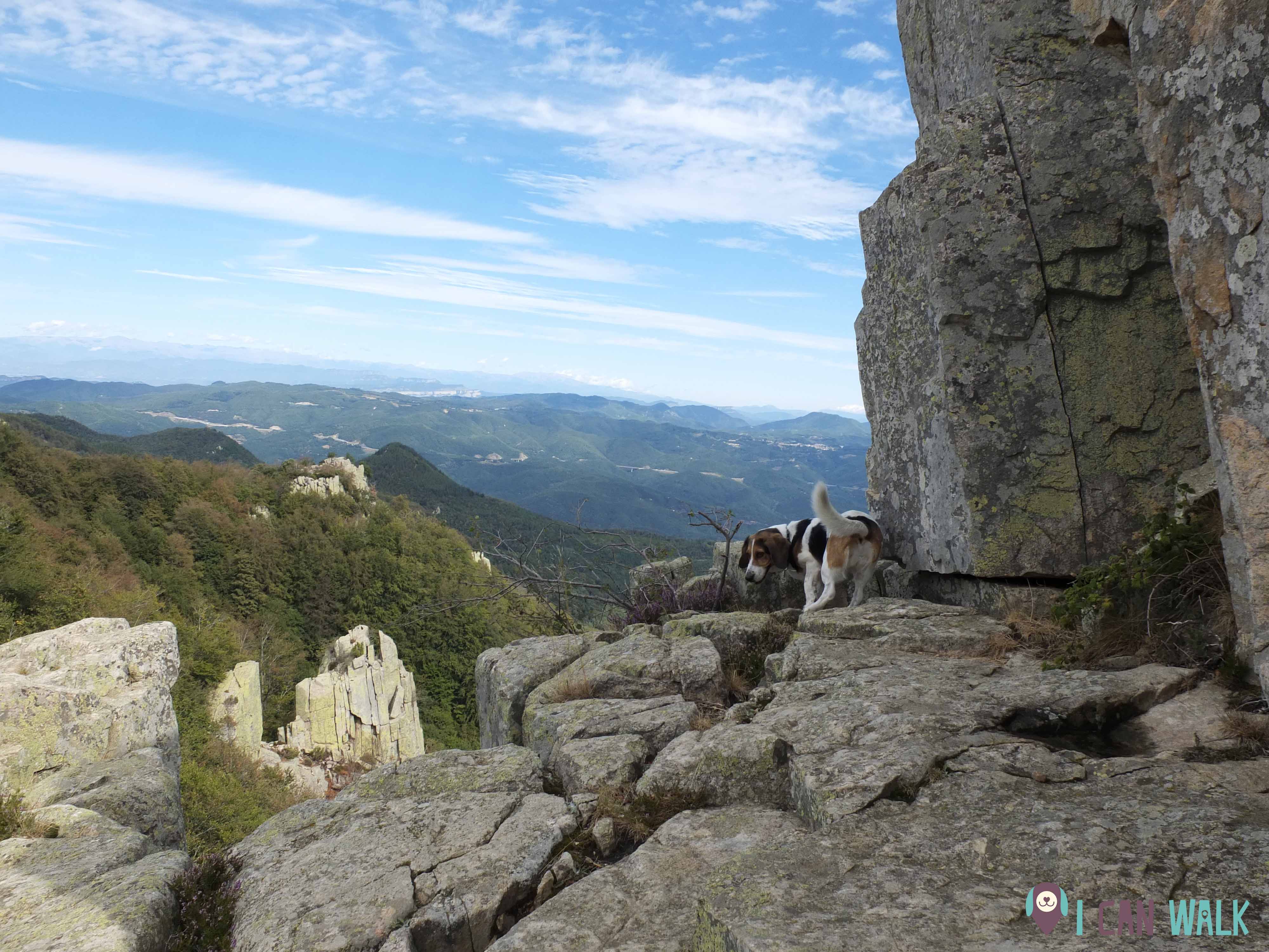 Cuando llegues a un murito de piedra, el camino se puede perder un poquito entre los árboles, has de seguir recto hacia arriba, hasta llegar a un poste vertical que indica que a tu izquierda sigue el camino del Turó de Morou. Justo después del poste hay un mirador hecho de rocas, las vistas son bonitas, pero ojo con los perros no suban muy emocionados porque al otro lado hay un precipicio.