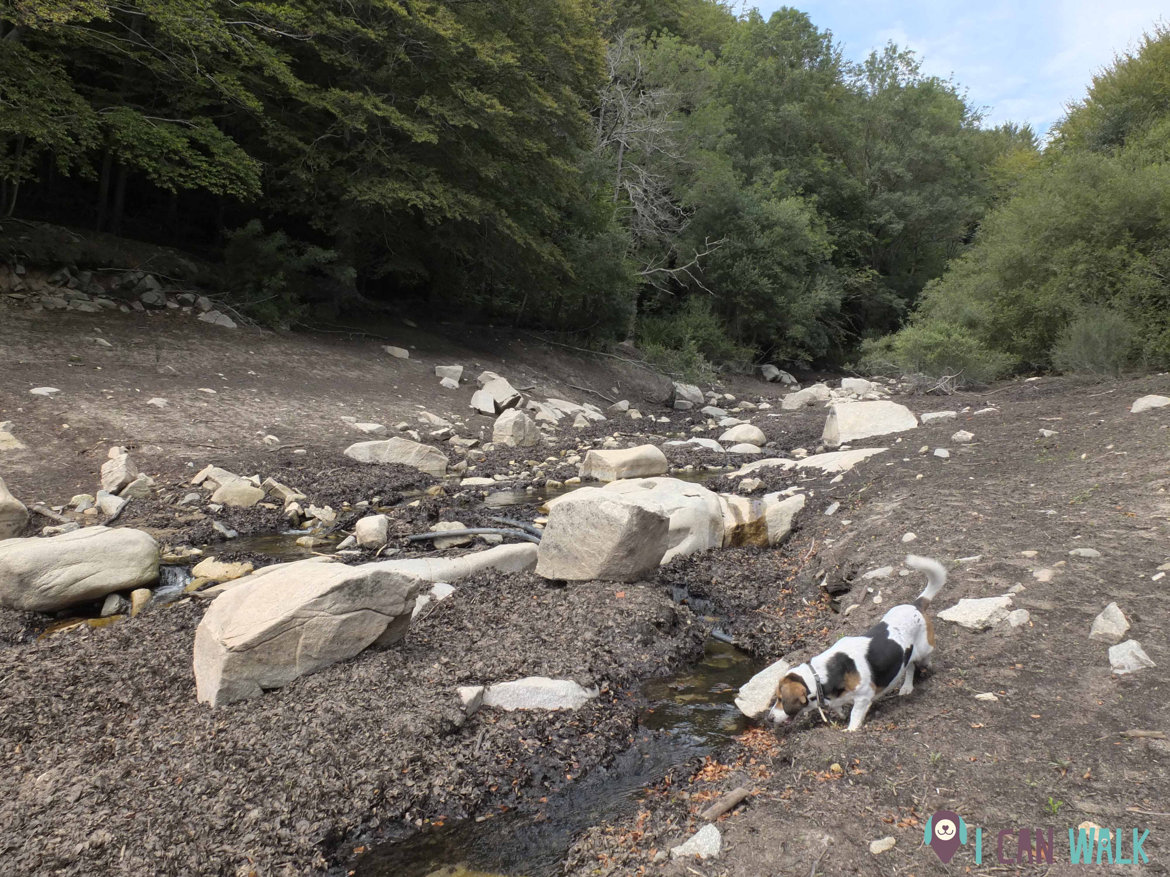 Al inicio del pantano vemos la riera de Santa Fe. El agua que baja está limpia, pero hay gran cantidad de materia en descomposición alrededor y en el fondo de la riera (hojas de los bosques que hemos pasado), de manera que los pies se pueden hundir en las zonas cercanas al agua, y a la que se metan los perros el agua pasará a ser marrón. Pese a esto, no nos hemos encontrado que huela mal.