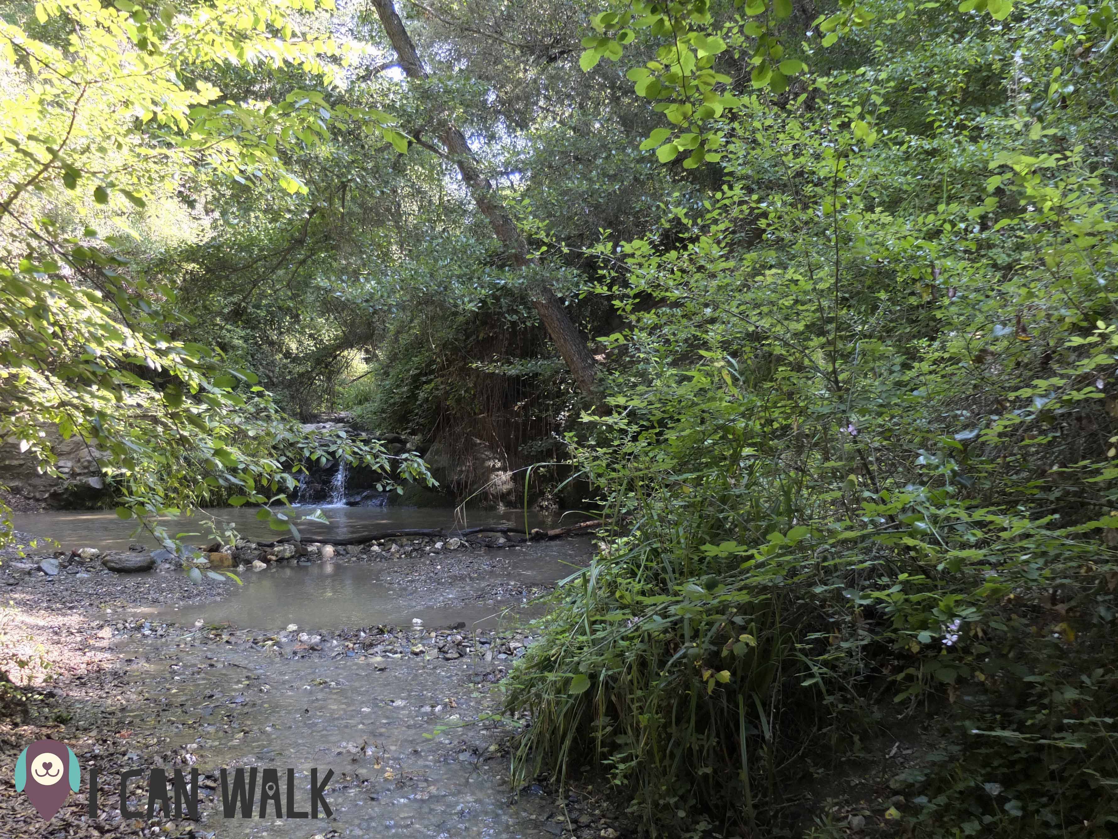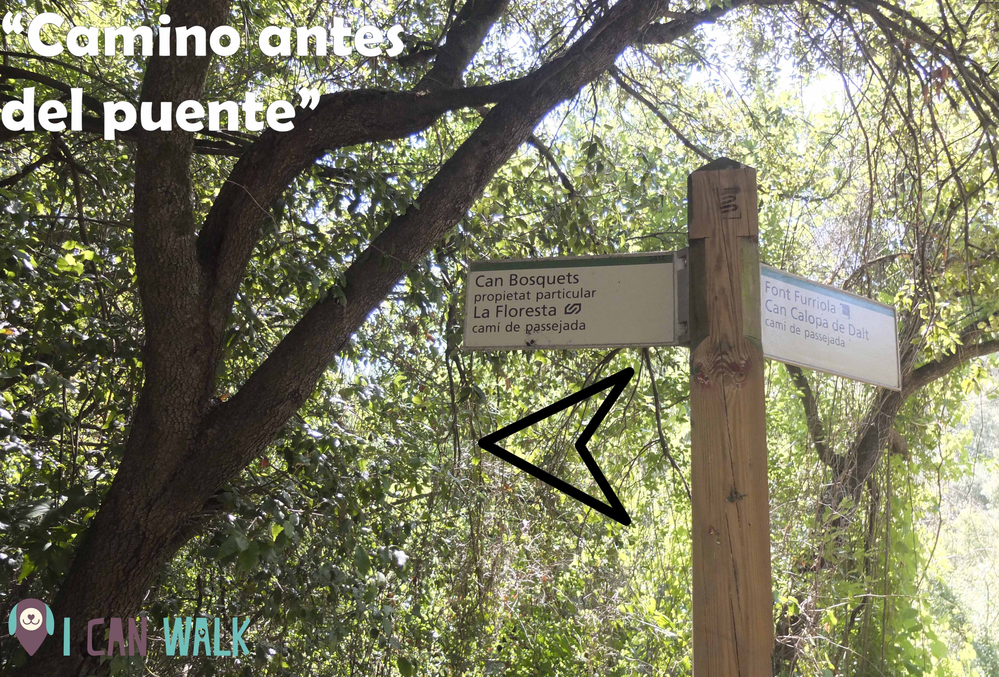 Vuelve al camino, cuando te encuentres el puente que cruza la riera, coge el camino de la izquierda, que indica el salto de agua con una señalización vertical. Por este tramo, si no hay sequía, tienes que cruzar un tramo con un poco de agua.