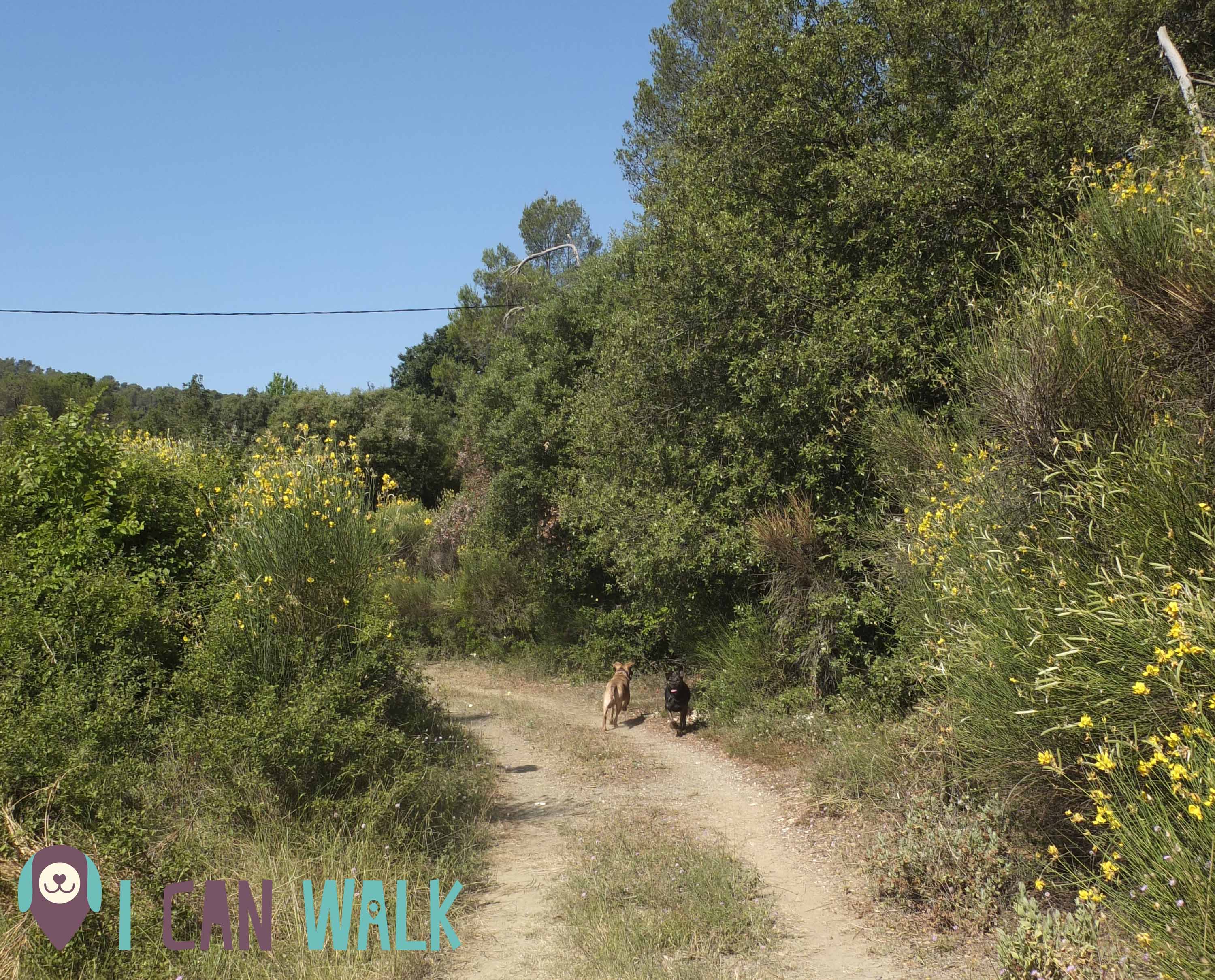 Una vez veas el parking de Can Bosc, de nuevo pueden pasar vehículos, así que quizás tengas que atar a tu perro hasta cruzar el camino asfaltado.