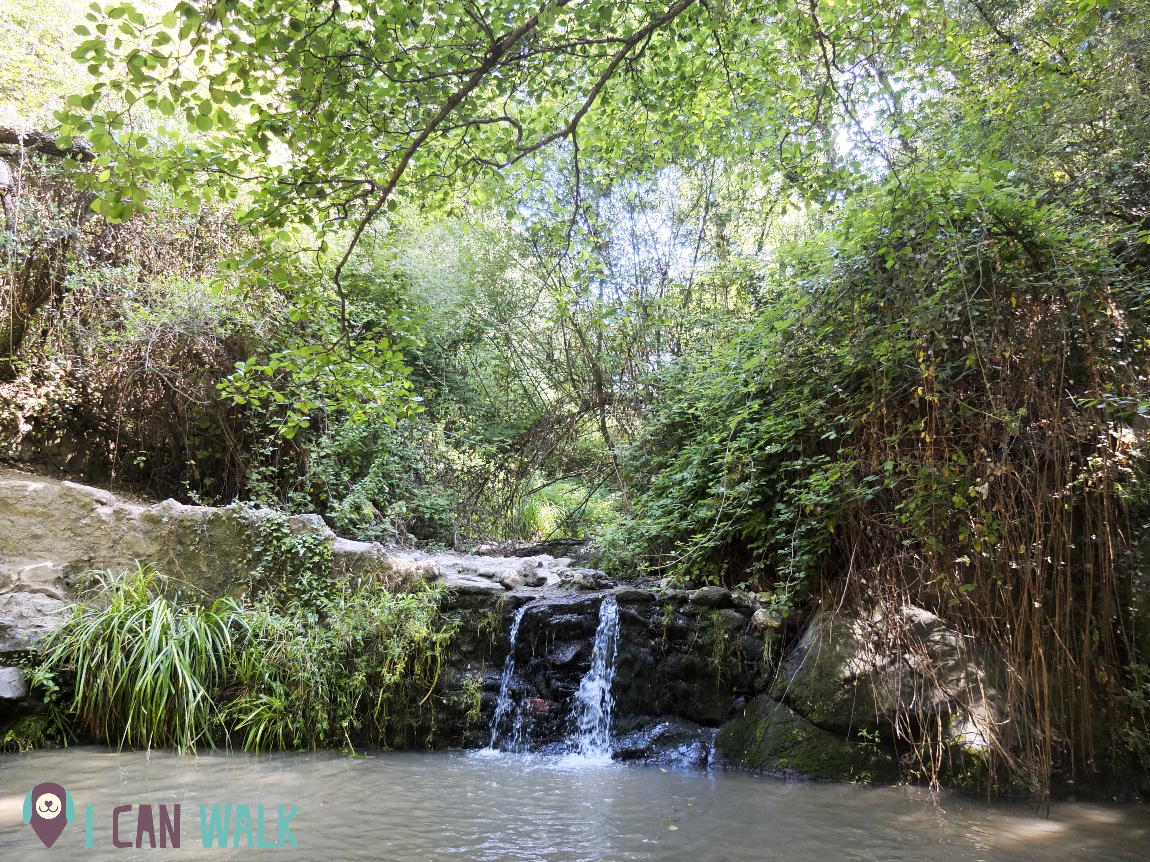 Una vez allí: cuando llegues al Balneario, puedes bajar por el lado derecho del edificio y justo enfrente verás el rio. Una vez veas el agua puedes ir a mano derecha o a mano izquierda: si es temprano es posible que estéis solos o casi solos, de modo que puedes comenzar por ir a la derecha. Esta zona suele comenzar a llenarse hacia media mañana, de familias que van a comer y bañarse. Hay una la pasarela con escaleras -que puede estar semi-inundada al principio del recorrido-, si la sigues llegaras a algunas zonas donde el agua es muy profunda y la gente se tira desde las rocas. Cuando la pasarela desciende y llegas de nuevo a nivel del agua, hay una zona de piscina natural muy agradable donde remojarse.